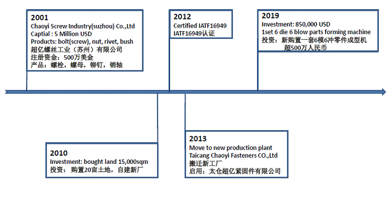 太仓超亿紧固件有限公司成立于2001年08月,是台湾独资企业。注册资金500万美金,总投资额1000万美金,占地1.5万平方米。公司引进全套先进的台湾多冲程冷镦机器,拥有完善的检测仪器, 生产各种材质的非标件螺栓,螺母及轴类零件。公司于2012年5月通过了IATF16949认证,对汽车五金产品的研究及开发具备丰富的经验。产品应用于汽车,高档建筑,电子,电机,电动工具,自行车,运动器材等行业,主要用于出口和提供国内知名企业配装。
